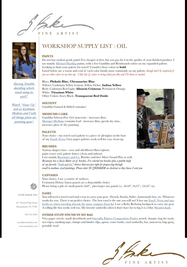 - This mentorship-style plein air oil painting workshop is designed for painters who are ready to move forward with clarity and intention. • Prior to the workshop, participants will complete a brief questionnaire so Suzie can better understand where they are in their artistic journey. Each artist will receive a scheduled one-on-one session to discuss strengths, challenges, and specific next steps for growth. During the in-person workshop, participants will paint together on location in Rockport. Suzie will demonstrate outdoors, explain her decision-making process, and provide individualized guidance at each easel — building on the goals and intentions identified during the mentorship session. This workshop is best suited for intermediate to advanced painters. Motivated beginners with a solid working knowledge of materials are welcome.